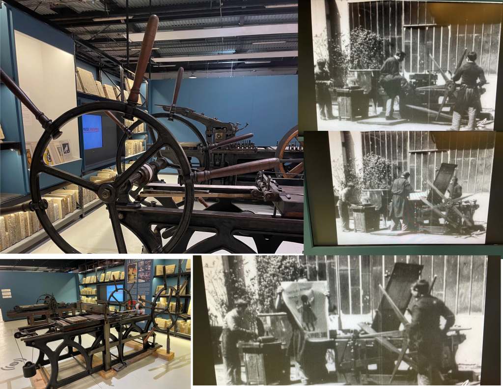 La presse lithographique est aussi une autre technique d’impression dans la chaine graphique de production d’un atelier, avec une Pierre montée sur un chariot qui se déplace sous le dispositif de pression, d’abord une planche de bois dans un mouvement vertical « le râteau », puis avec la mécanisation, un cylindre sur lequel on engage sur le rouleau la feuille de papier. Avec donc un retour en arrière avec feuille à feuille qui se mécanisera de plus en plus par la suite. Se sont 4 ouvriers ou 2 minimums qui sont indispensables pour faire tourner cette machine. Senefelder publie en 1818 un Manuel détaillé l’art de la lithographie réédité à Paris et à Londres en 1819, manuel qui amorce en quelque sorte le futur de l’imprimerie puisque son procédé amènera ensuite l’objet imprimé : le report sur la Pierre d’impression obtenue par d’autres procédés typographiques, taille douce et bientôt la photographie, puis la lithographie en zinc où la Pierre est remplacée par une feuille de métal, susceptible d’être ensuite courbée et montée en cylindres.