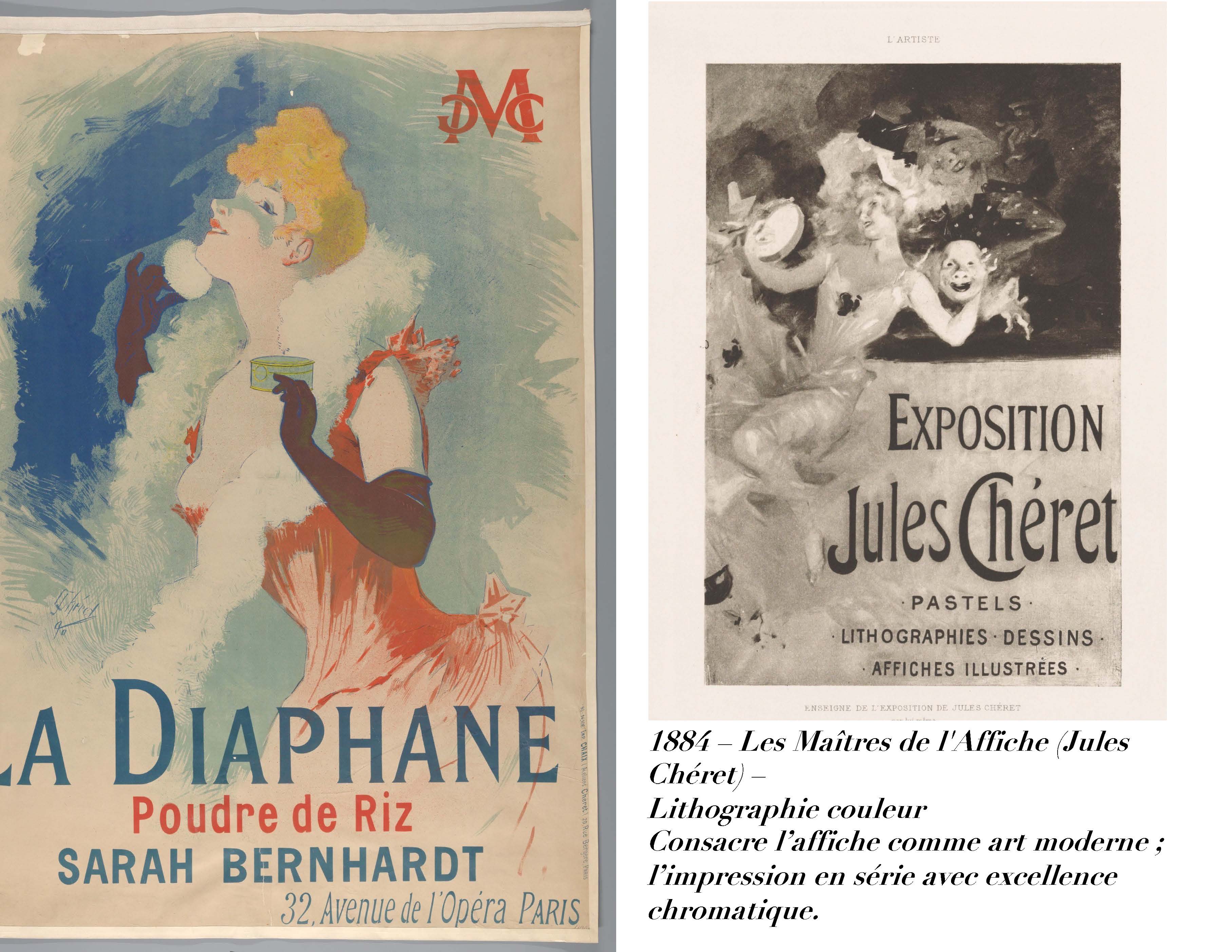 - Des artistes comme Jules Chéret ou Toulouse-Lautrec font de l’affiche un art à part entière. Mais tirages coûteux, lent processus de chromolithographie.