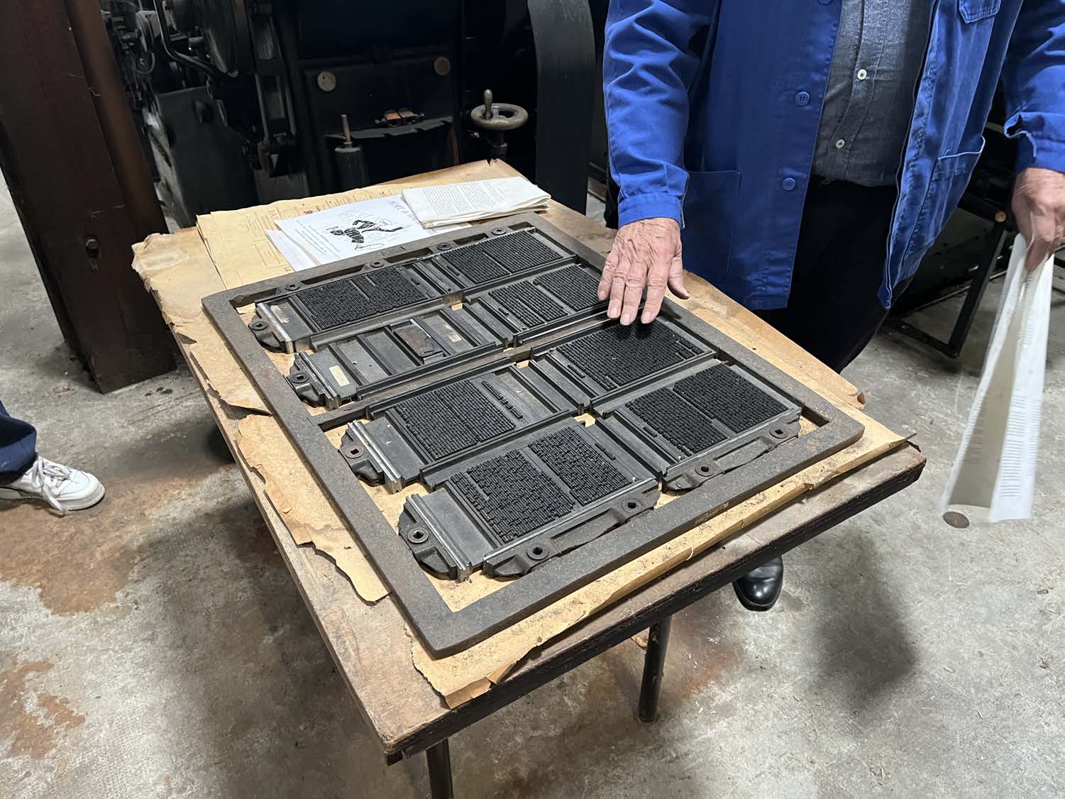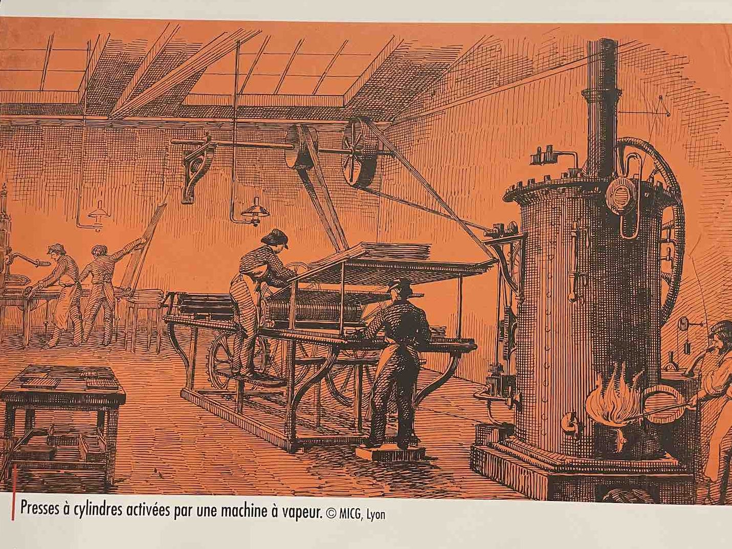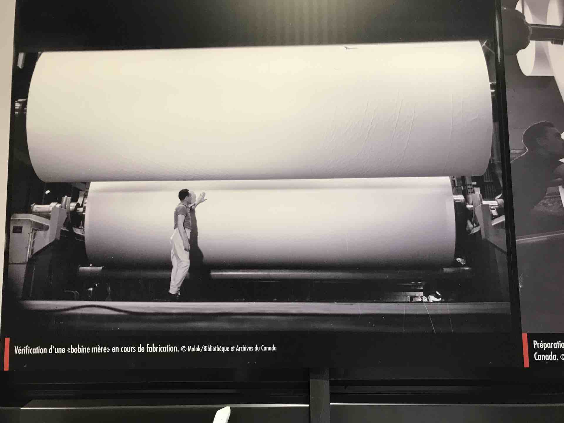 La matière première de l’imprimé rassemblés en rouleaux gigantesques, semble dompté par ce petit homme dans un cliché qui rappelle « les temps modernes ».