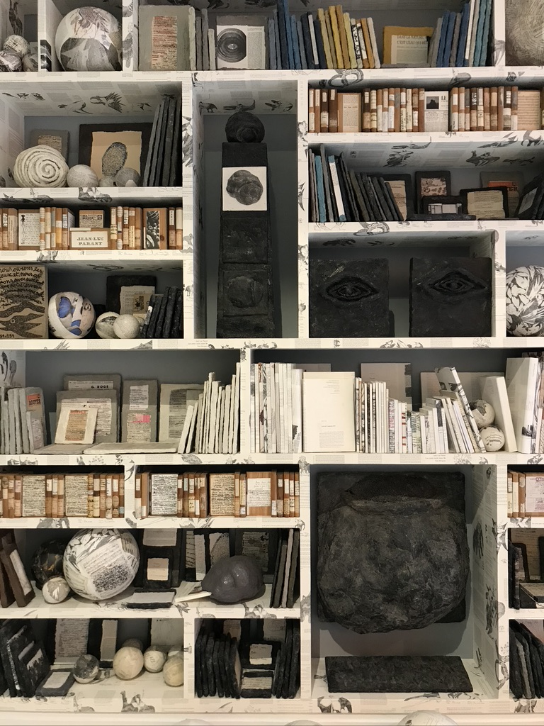 L’espace des Signes – Jean-Luc Parant 2018, Atelier Musée AMI Malesherbes. Des objets / curiosités / yeux sculptures /ex-voto /masses / orbes, tous objets de papier mâché peints, comme autant de libations dédiées à la curiosité insatiable.