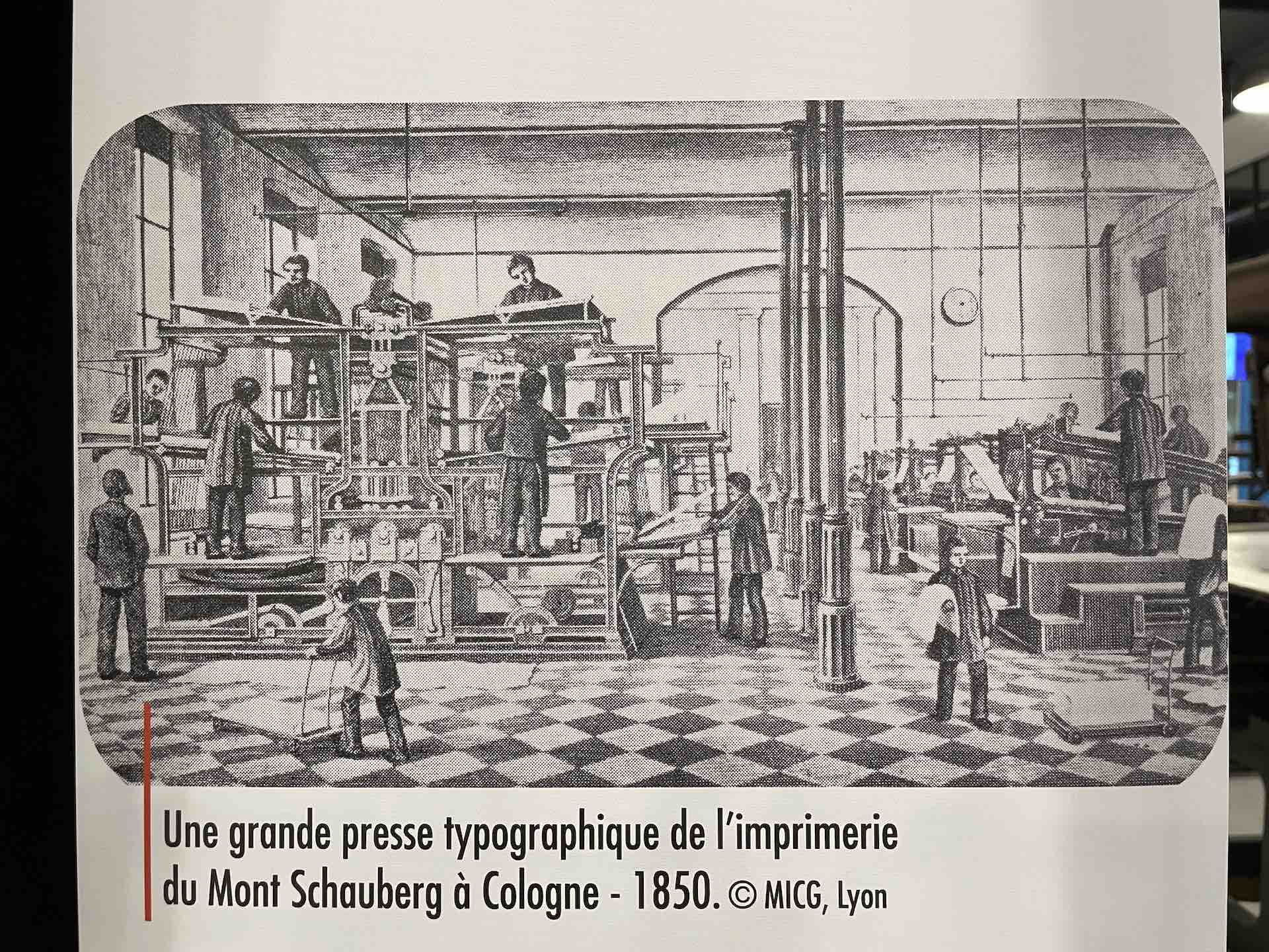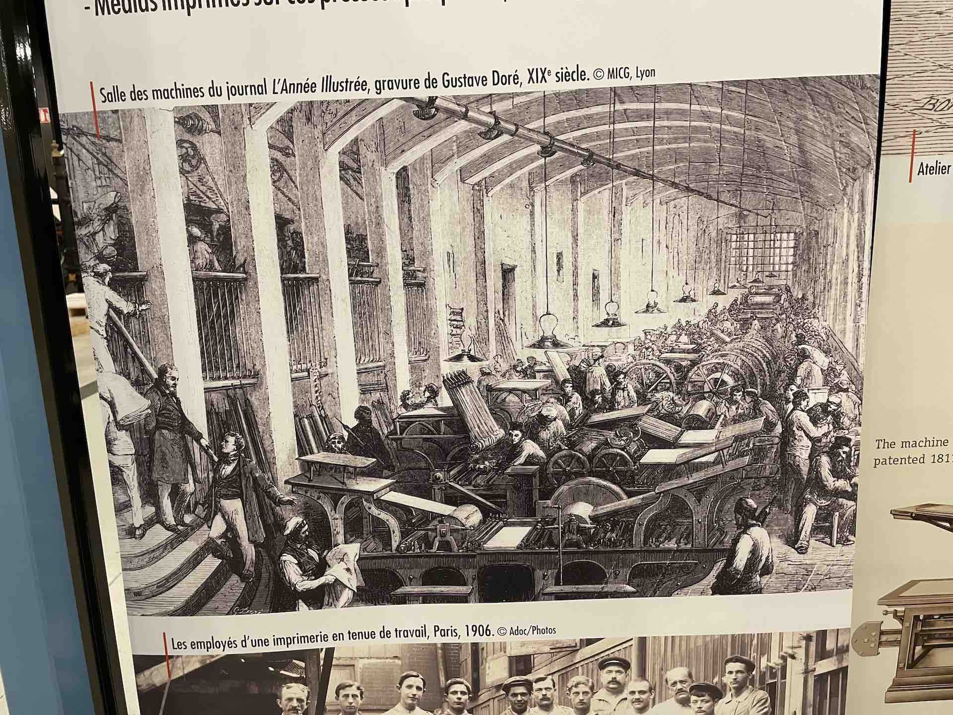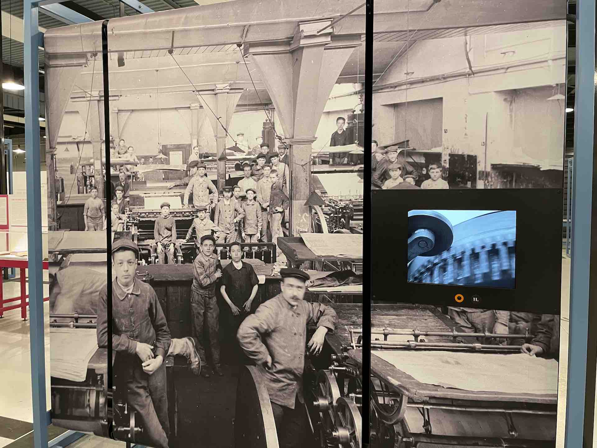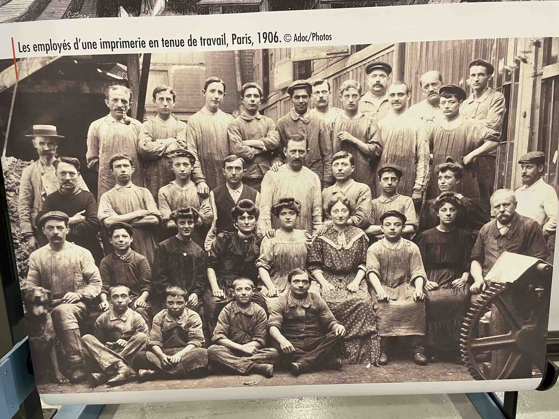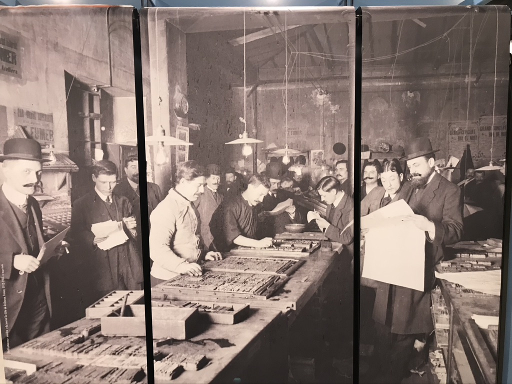 De nombreux documents iconographiques accompagnent la visite, disposés en très larges tirages polyptyques, ils affichent de nombreux témoignages photographiés de l’époque où les imprimeries étaient de véritables ruches, les ateliers dont la diversité des corps de métiers, les générations rassemblés dans un certain état d’esprit corporatiste par le costume et les accessoires, tels bleu de chauffe et casquette, pour les ouvriers machiniste. Des ruches certes de Bourdons, même si les femmes y tenait de nombreux postes, où toutes les publications scrutées, vérifiées, encadrées, recadrées, corrigées. Et dont la portée des communications et leur influence étaient peignées et leurs teneurs validées après de multiples filtres.