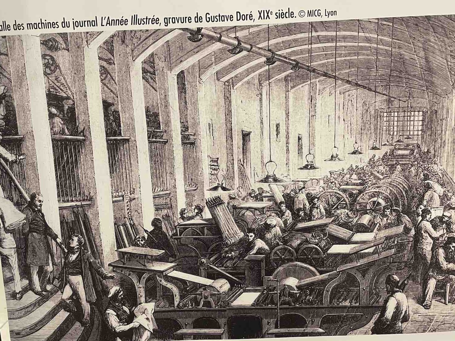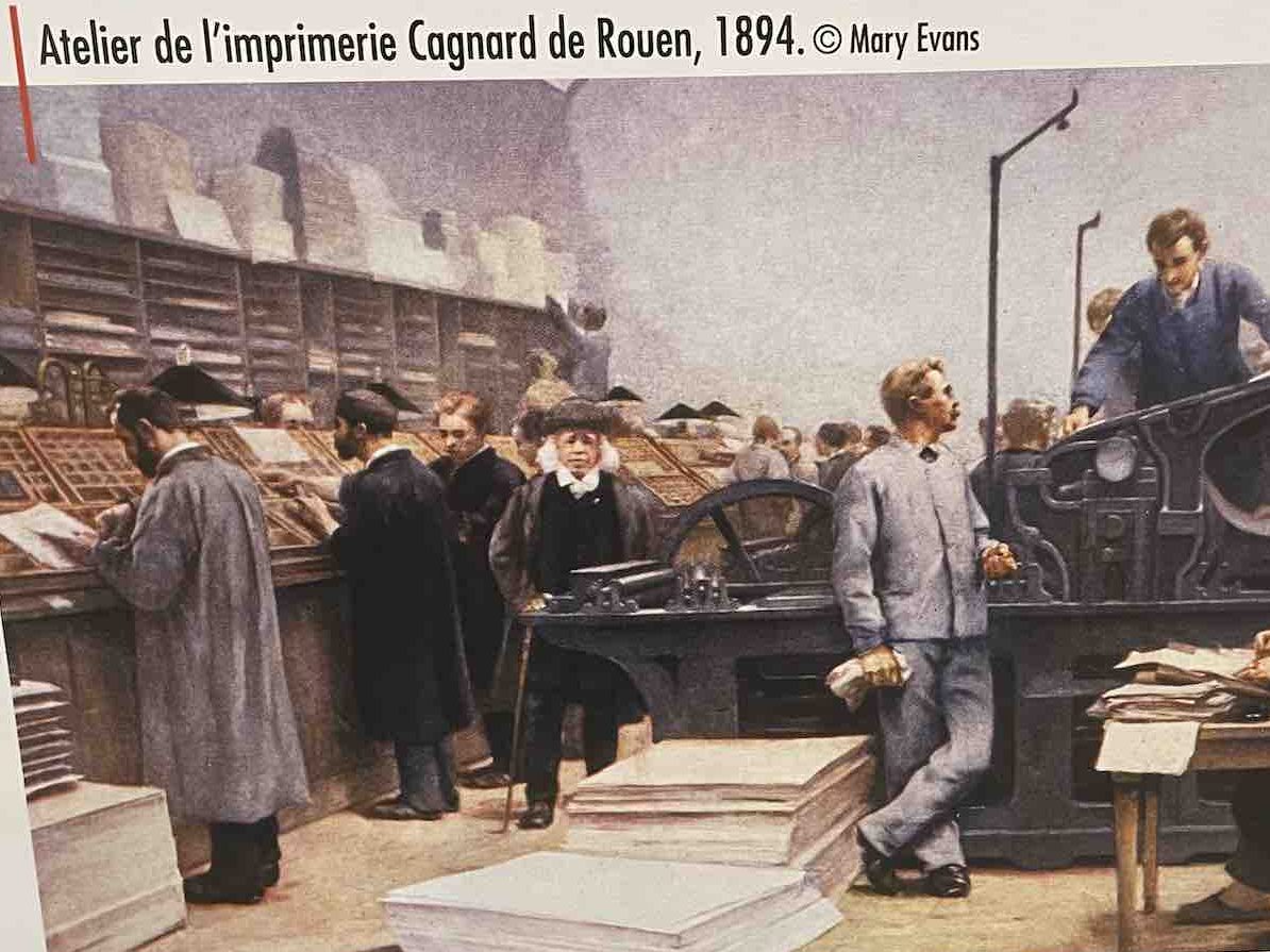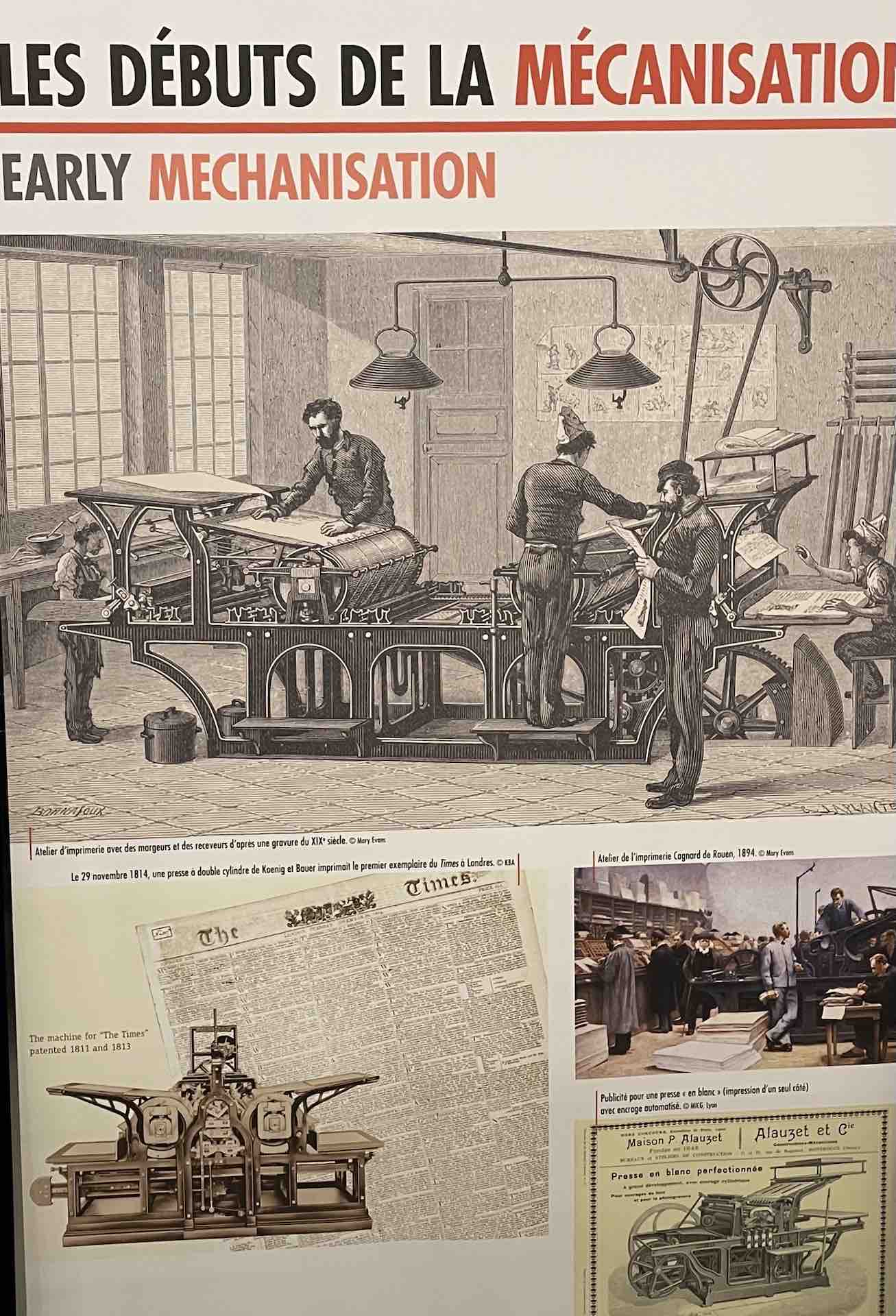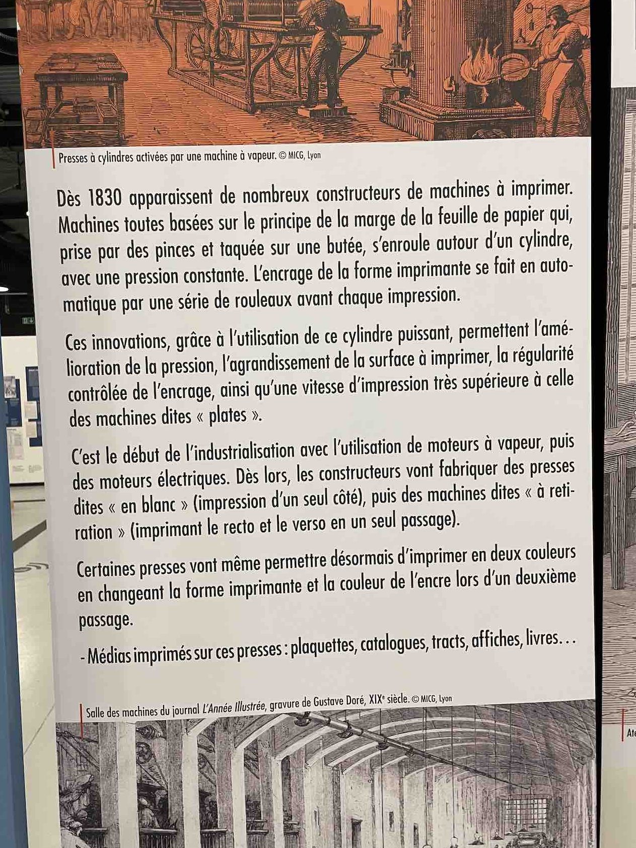 De nombreux documents iconographiques accompagnent la visite, disposés en très larges tirages polyptyques, ils affichent de nombreux témoignages photographiés de l’époque où les imprimeries étaient de véritables ruches, les ateliers dont la diversité des corps de métiers, les générations rassemblés dans un certain état d’esprit corporatiste par le costume et les accessoires, tels bleu de chauffe et casquette, pour les ouvriers machiniste. Des ruches certes de Bourdons, même si les femmes y tenait de nombreux postes, où toutes les publications scrutées, vérifiées, encadrées, recadrées, corrigées. Et dont la portée des communications et leur influence étaient peignées et leurs teneurs validées après de multiples filtres.