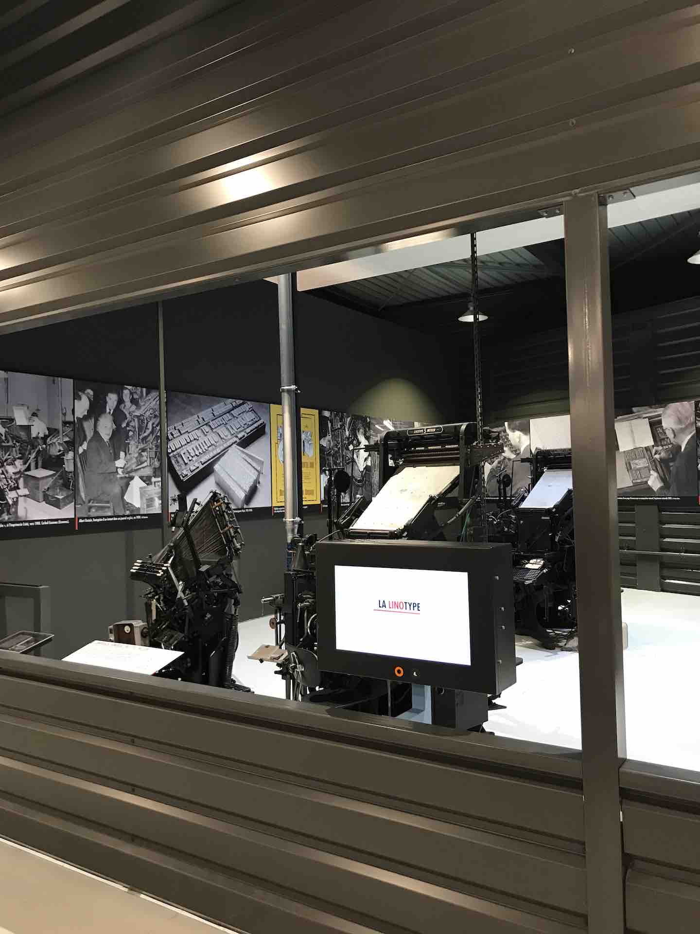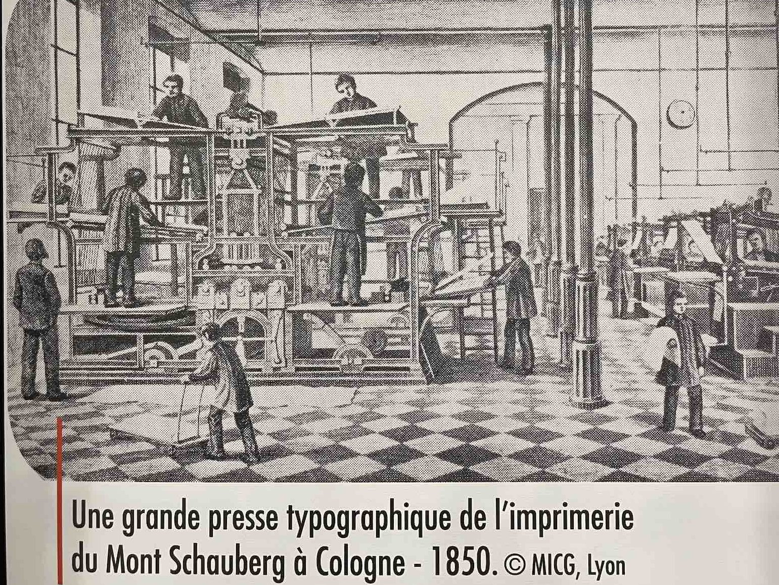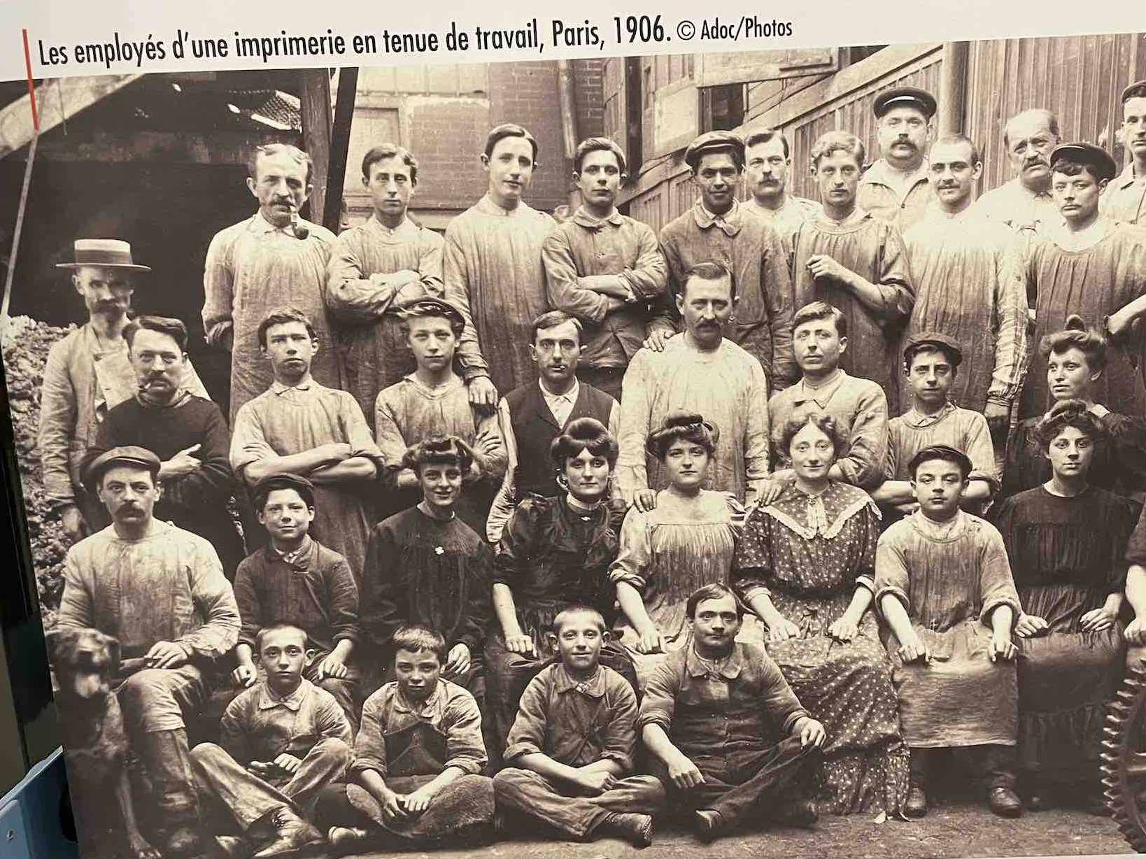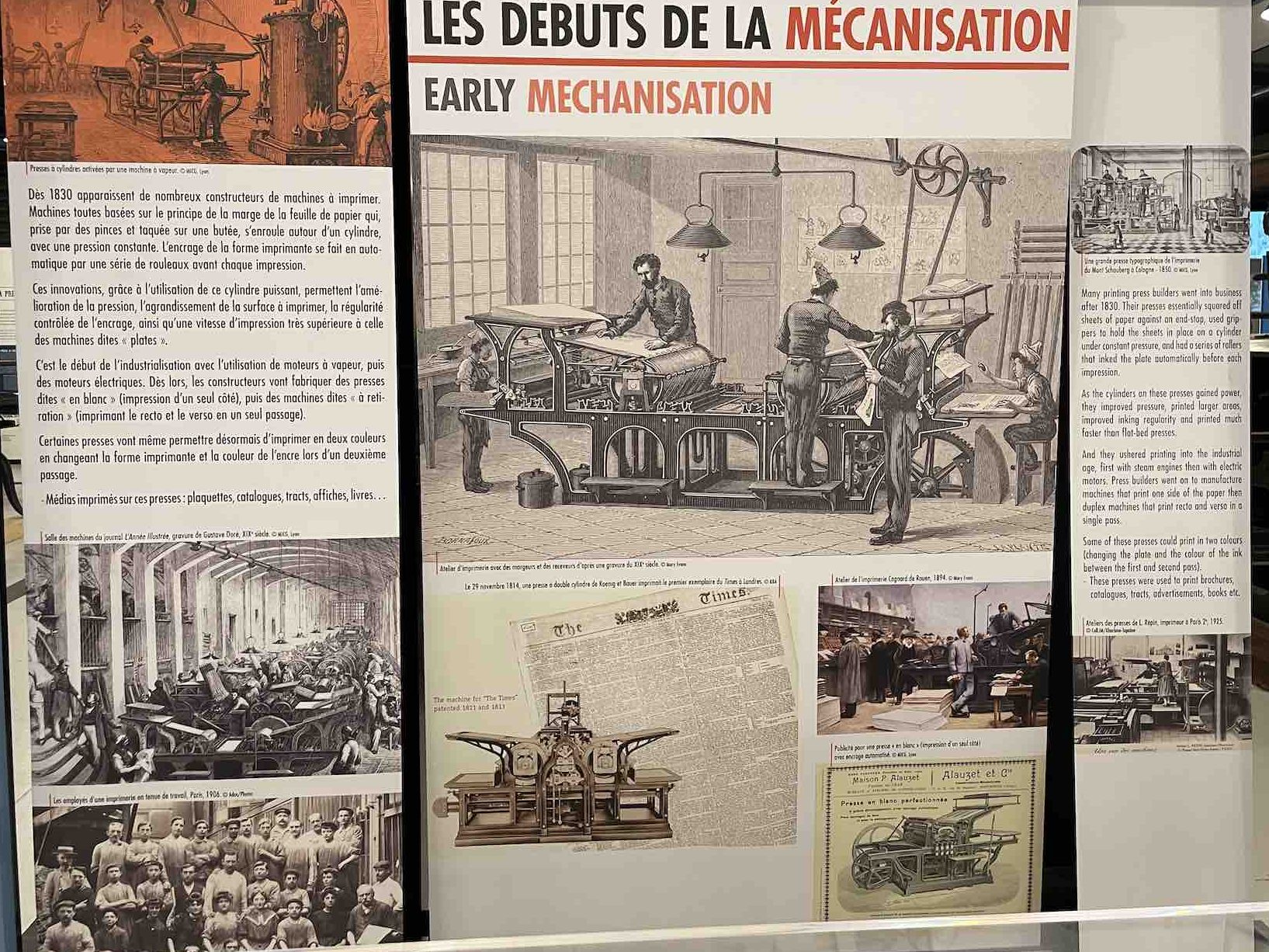 De nombreux documents iconographiques accompagnent la visite, disposés en très larges tirages polyptyques, ils affichent de nombreux témoignages photographiés de l’époque où les imprimeries étaient de véritables ruches, les ateliers dont la diversité des corps de métiers, les générations rassemblés dans un certain état d’esprit corporatiste par le costume et les accessoires, tels bleu de chauffe et casquette, pour les ouvriers machiniste. Des ruches certes de Bourdons, même si les femmes y tenait de nombreux postes, où toutes les publications scrutées, vérifiées, encadrées, recadrées, corrigées. Et dont la portée des communications et leur influence étaient peignées et leurs teneurs validées après de multiples filtres.