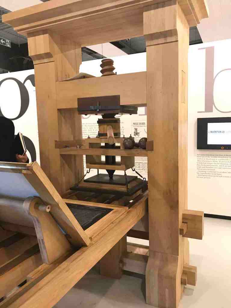 Un autre meuble/installation dans les premiers moments ou à examiner comme conclusion pour les derniers pas de la visite, est la restitution d’une reconstruction de la présumée première presse dîtes de Gutenberg.