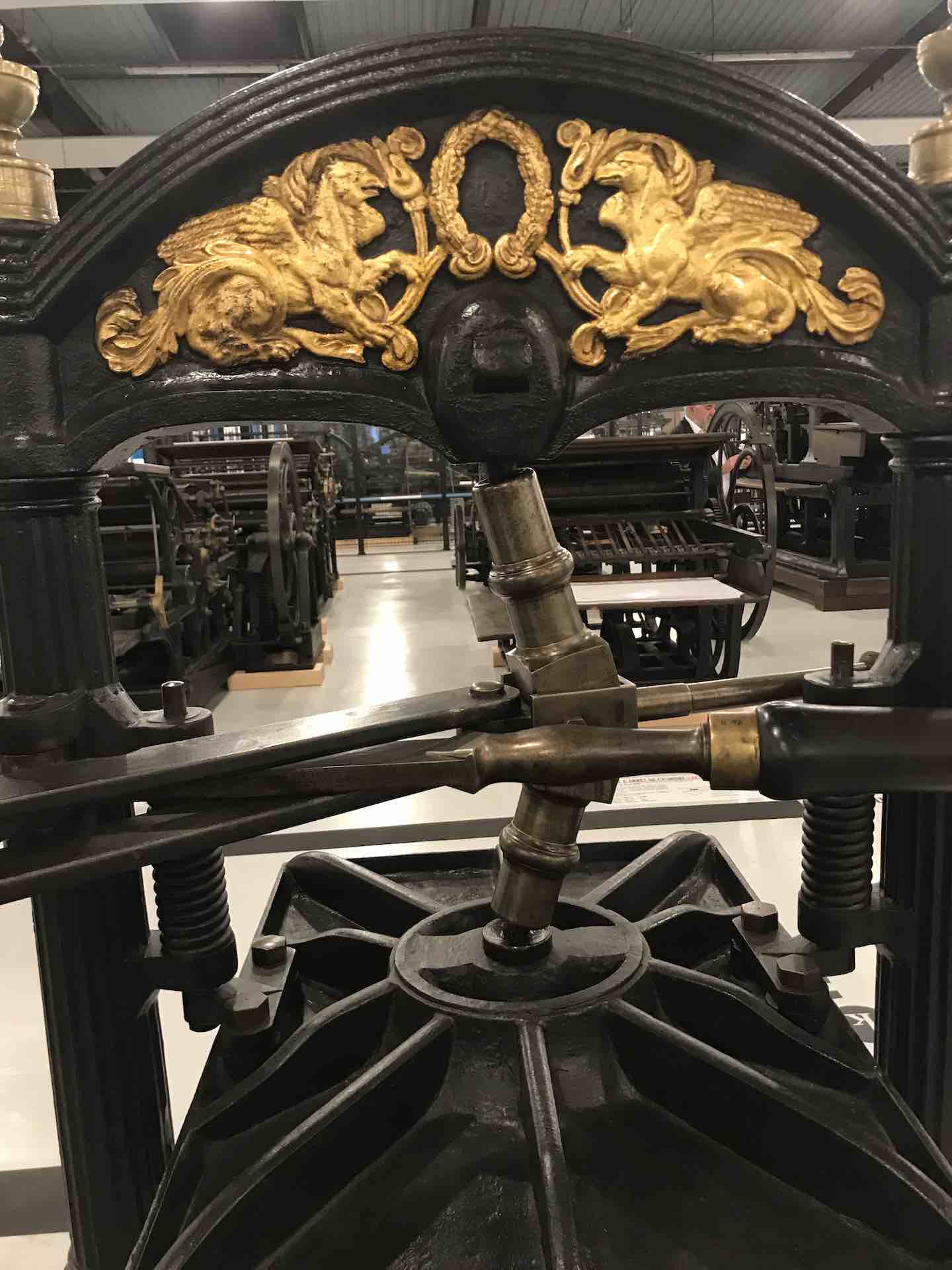 Pour d’autres détails, on retrouve les machines aux Griffons d’Or, l’Héraldique d’une animal merveilleux, gardien des sens et des énigmes, une figure ornementale liée à la catégorie sociale et aux activités spécifiques du monde de l’Imprimerie.