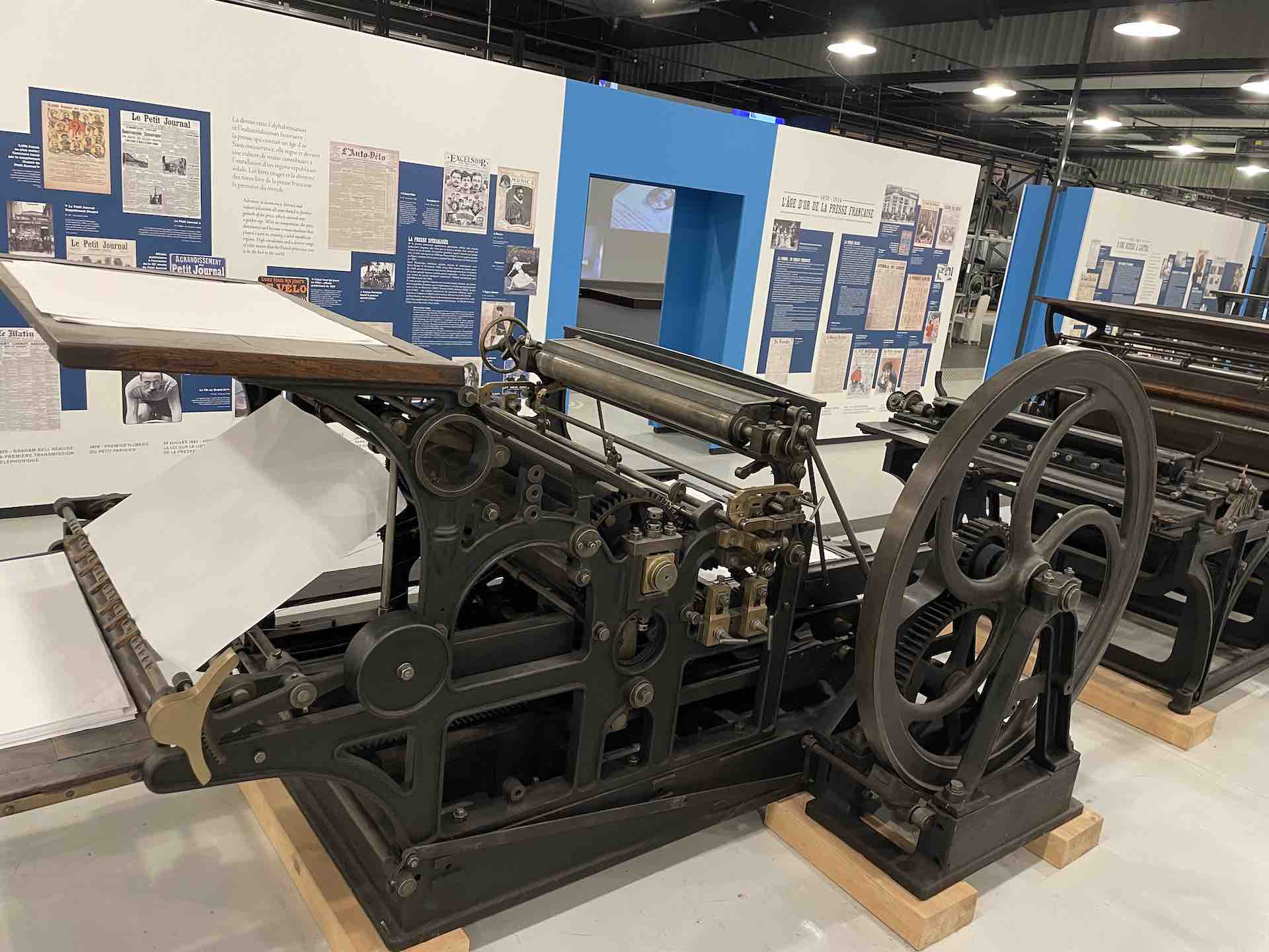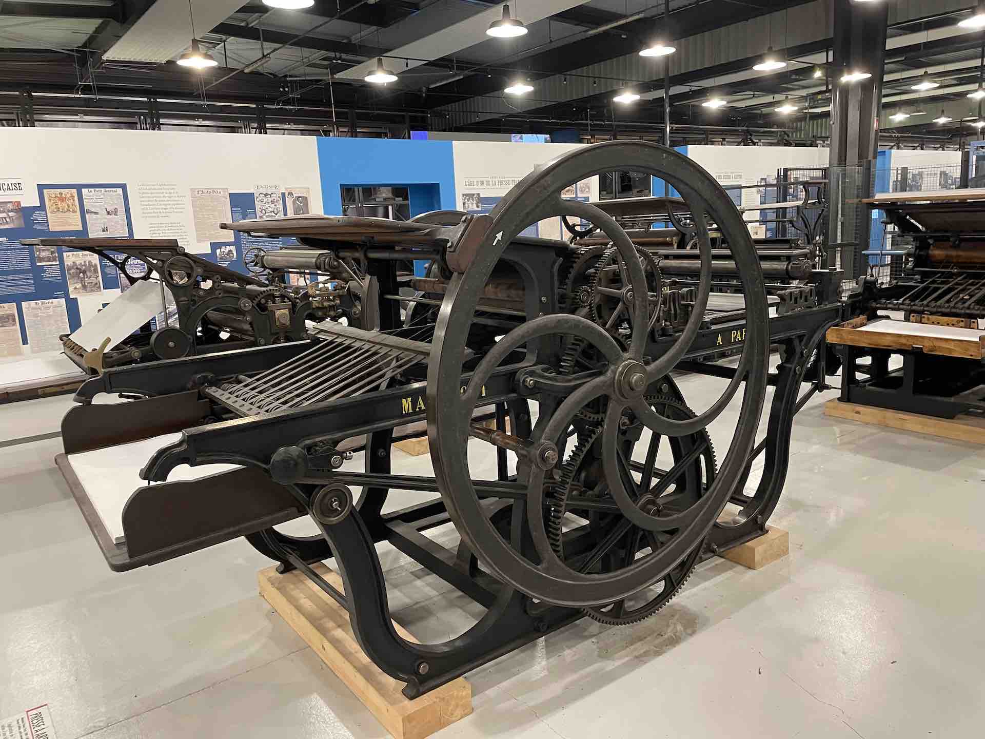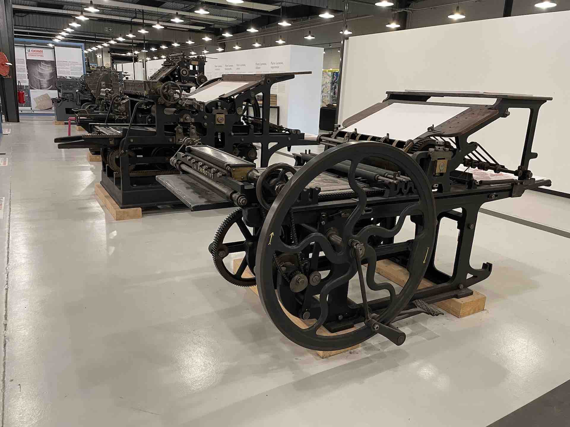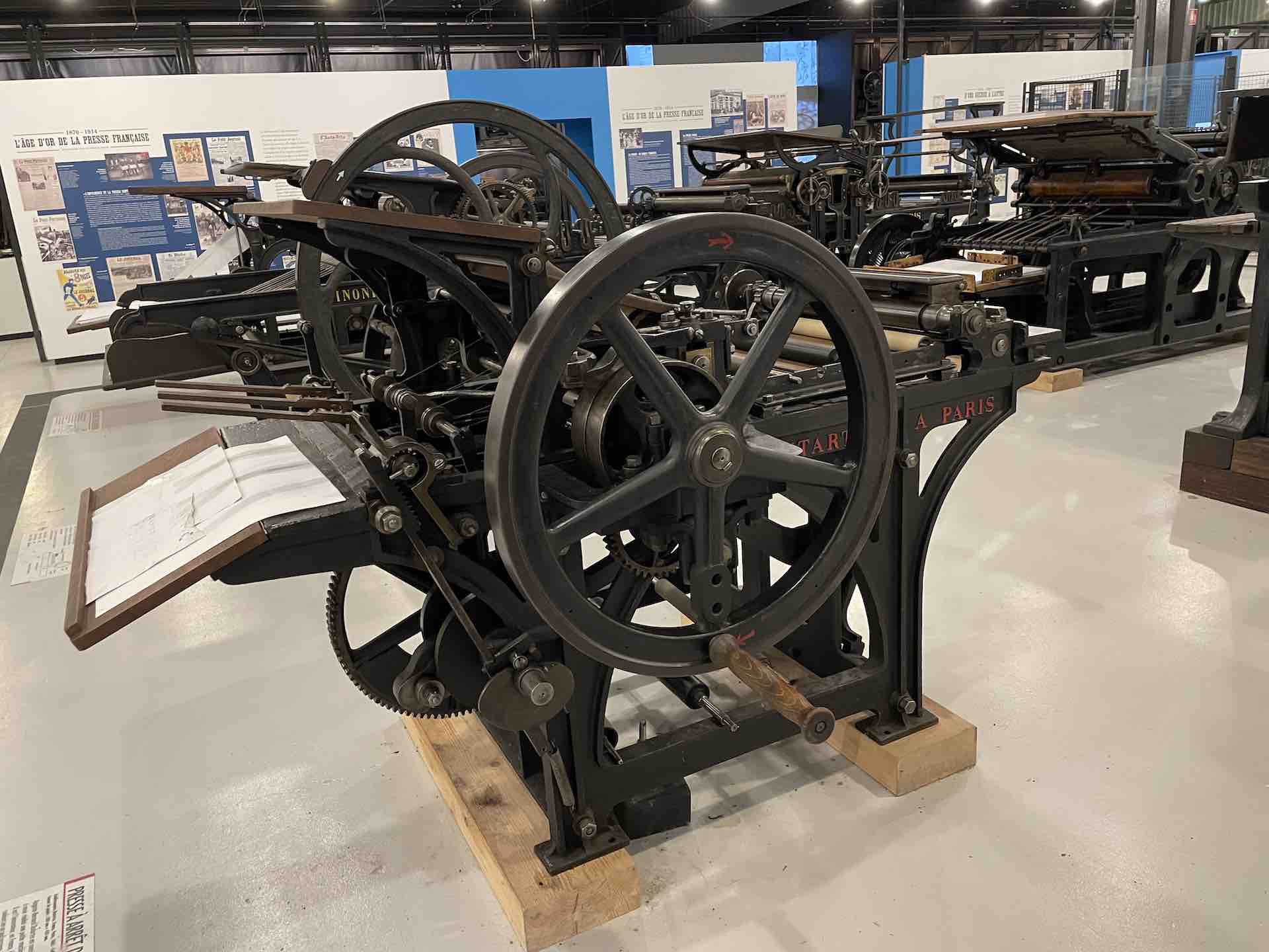 Les machines dont le Fonds Pozzoli est l’origine, un collectionneur passionné des mécaniques, sont mises en scène en majesté. On retrouve une rotative Goss, aux magnifiques rouages et rutilants rouleaux qui actionnées rappellent, par la rumeur continue de son fonctionnement, le niveau de nuisance sonore subie et supportée par les imprimeurs et le personnel travaillant dans les locaux professionnels, enchainant les embauches souvent en trois huit, les détails en sont protégés par une vitrine.