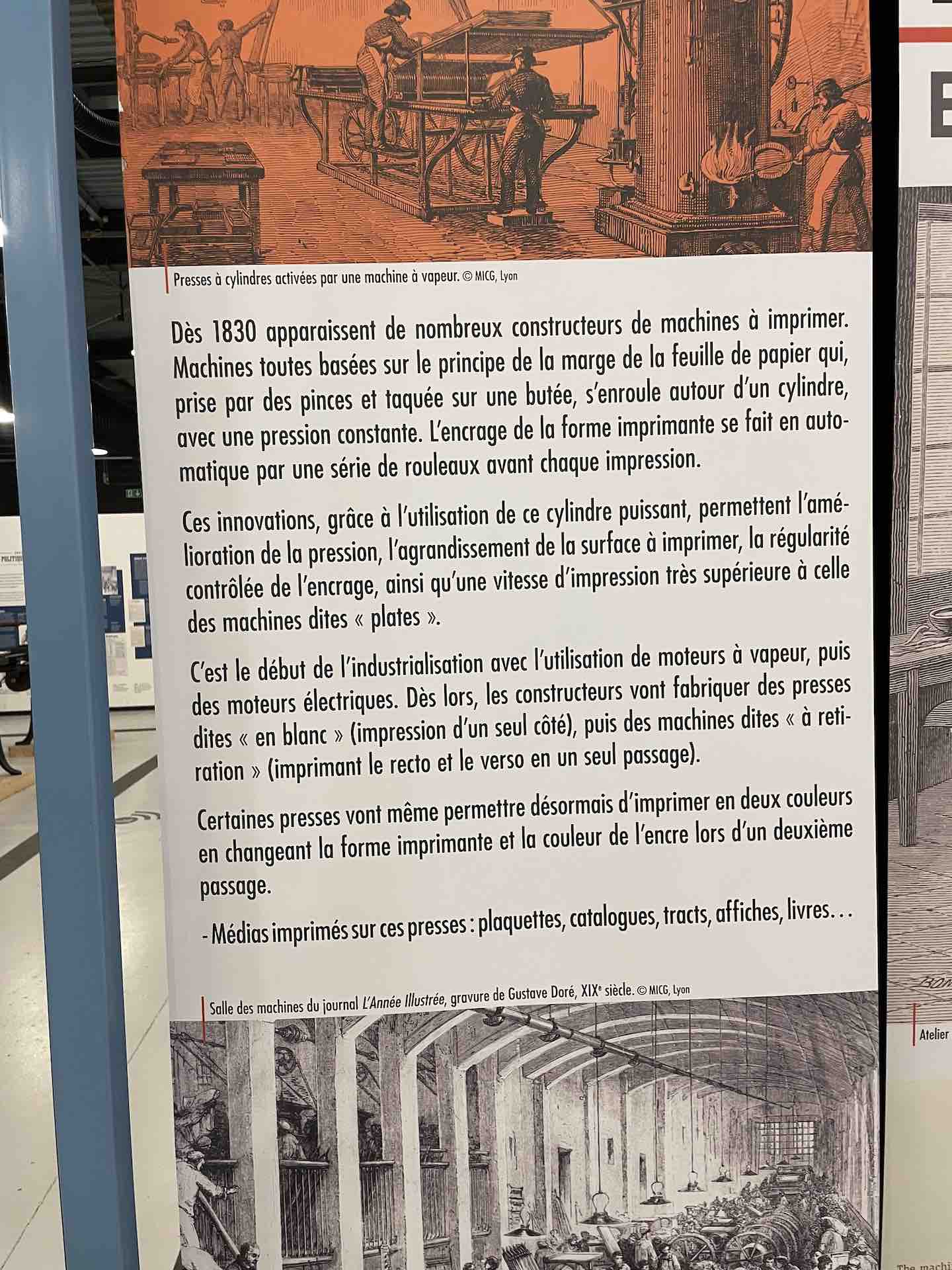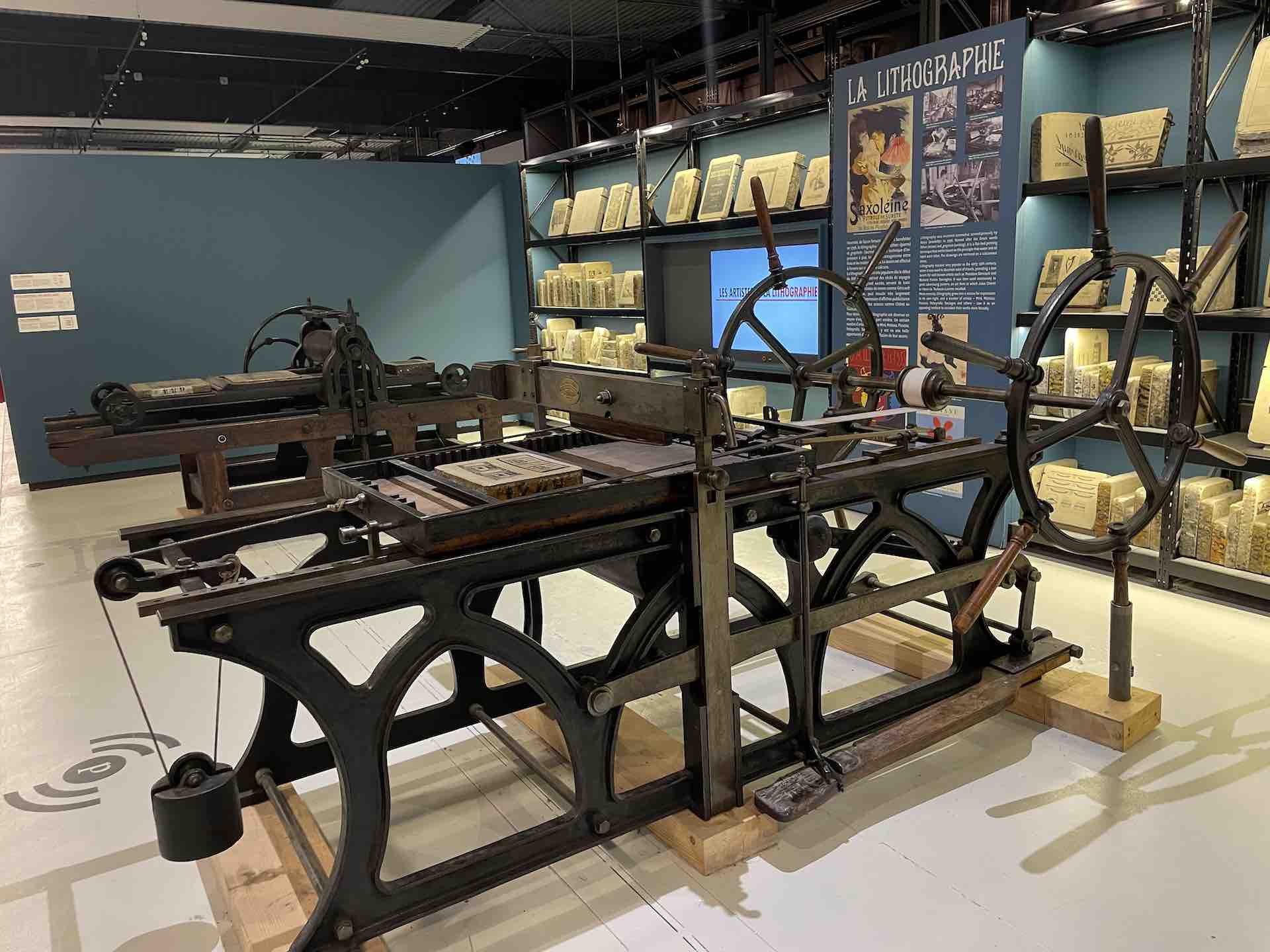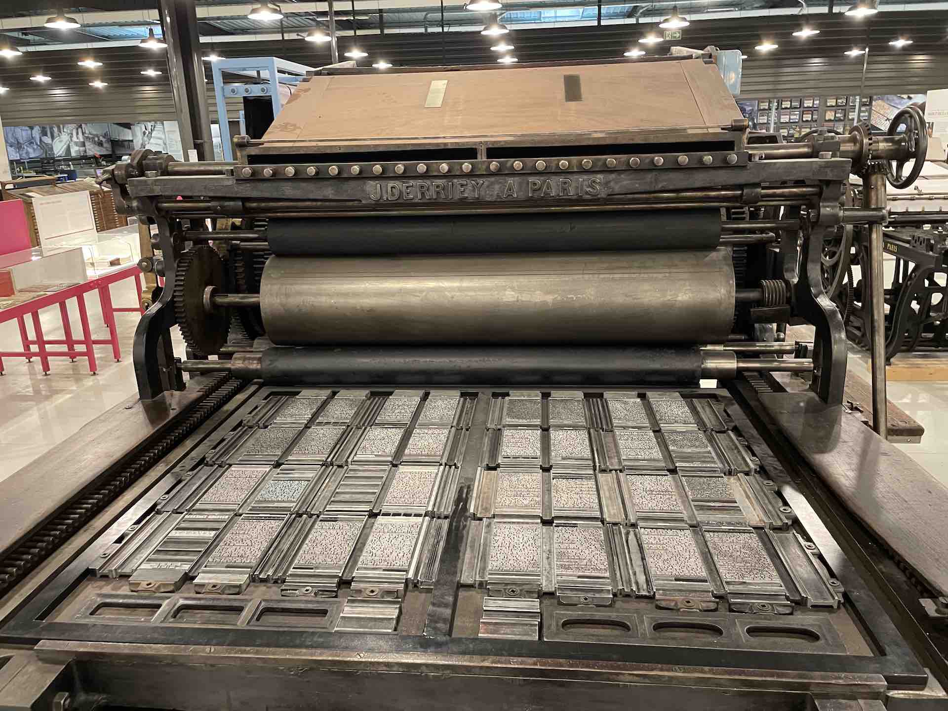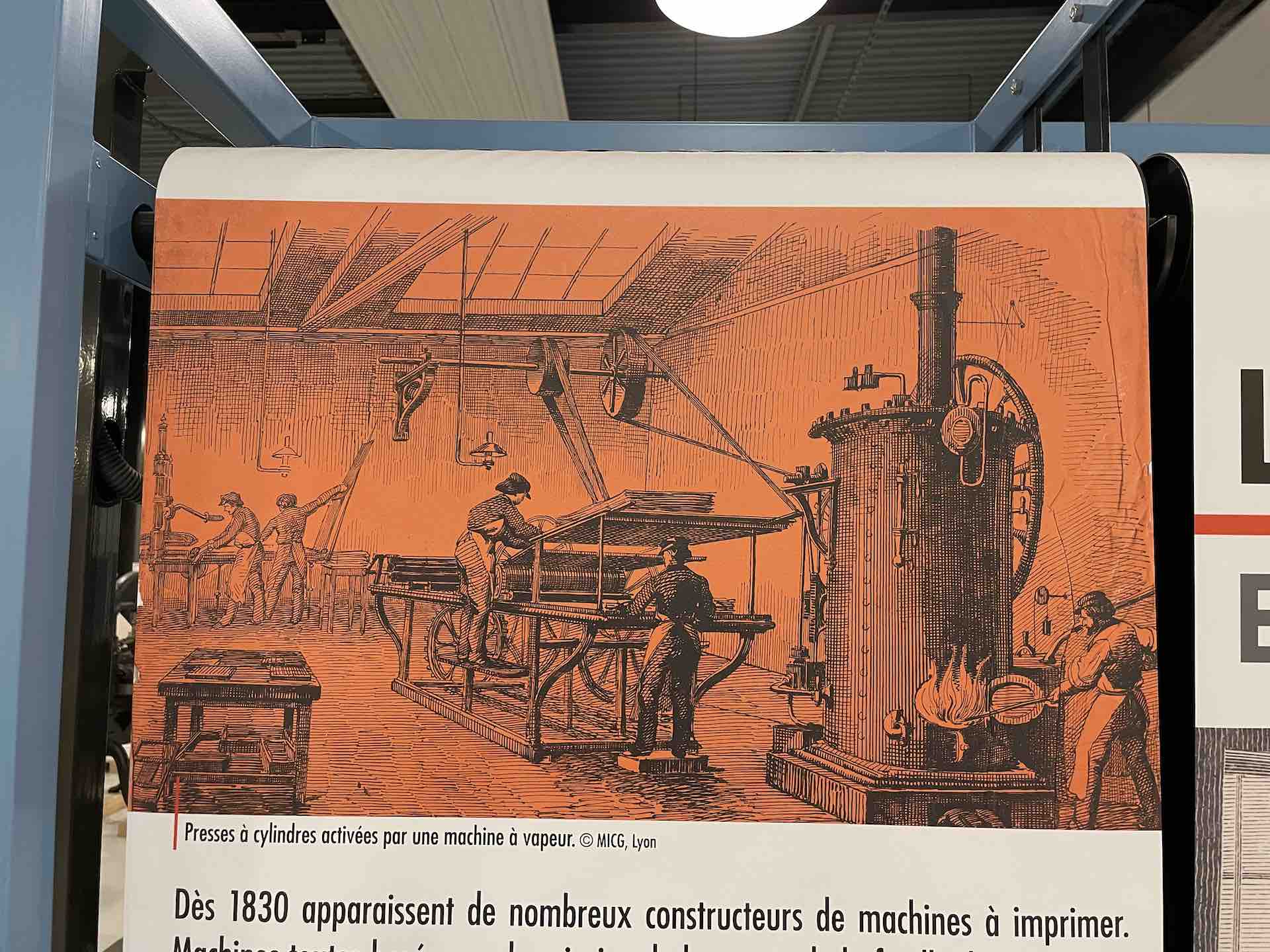 Les machines dont le Fonds Pozzoli est l’origine, un collectionneur passionné des mécaniques, sont mises en scène en majesté. On retrouve une rotative Goss, aux magnifiques rouages et rutilants rouleaux qui actionnées rappellent, par la rumeur continue de son fonctionnement, le niveau de nuisance sonore subie et supportée par les imprimeurs et le personnel travaillant dans les locaux professionnels, enchainant les embauches souvent en trois huit, les détails en sont protégés par une vitrine.