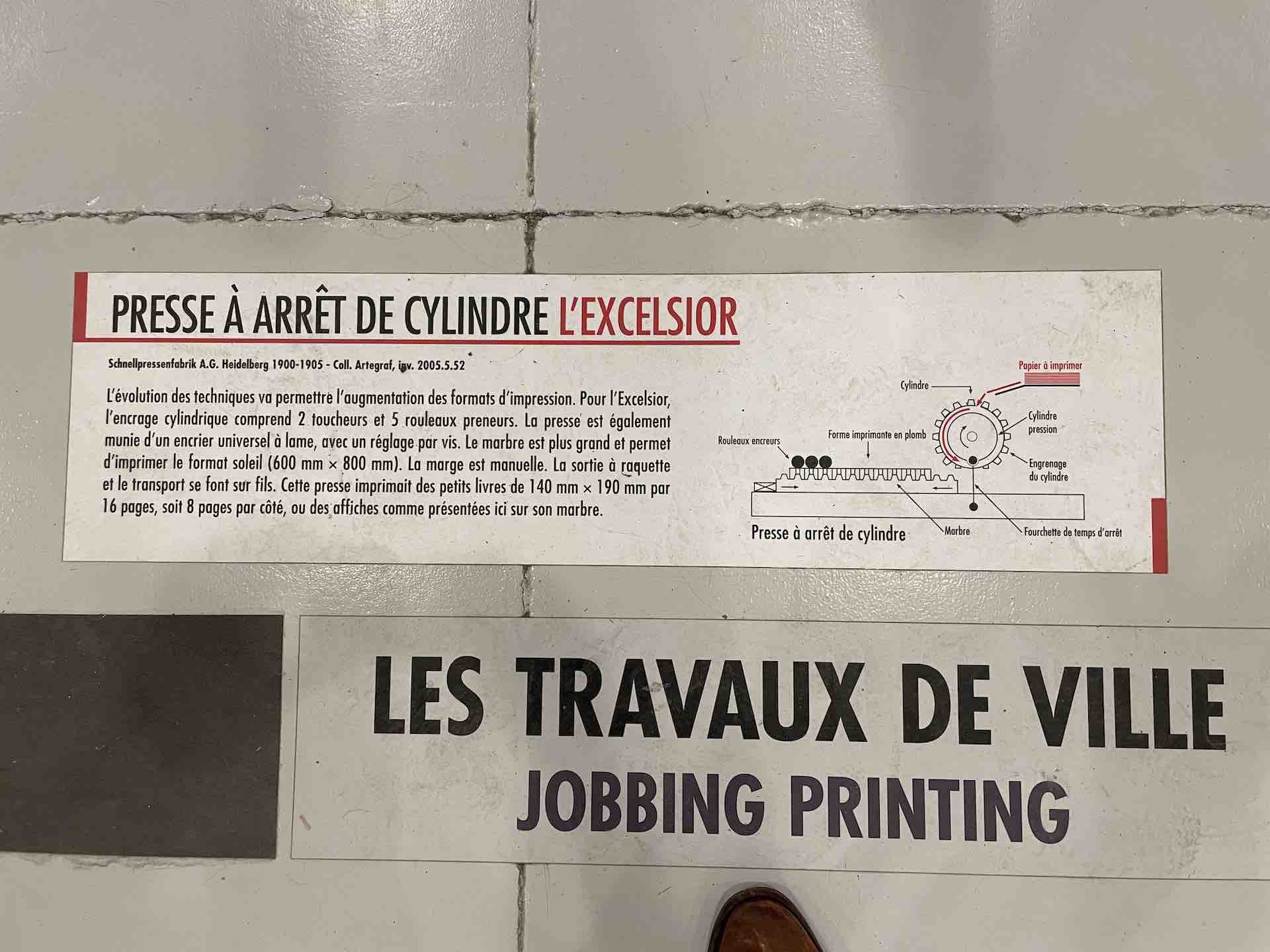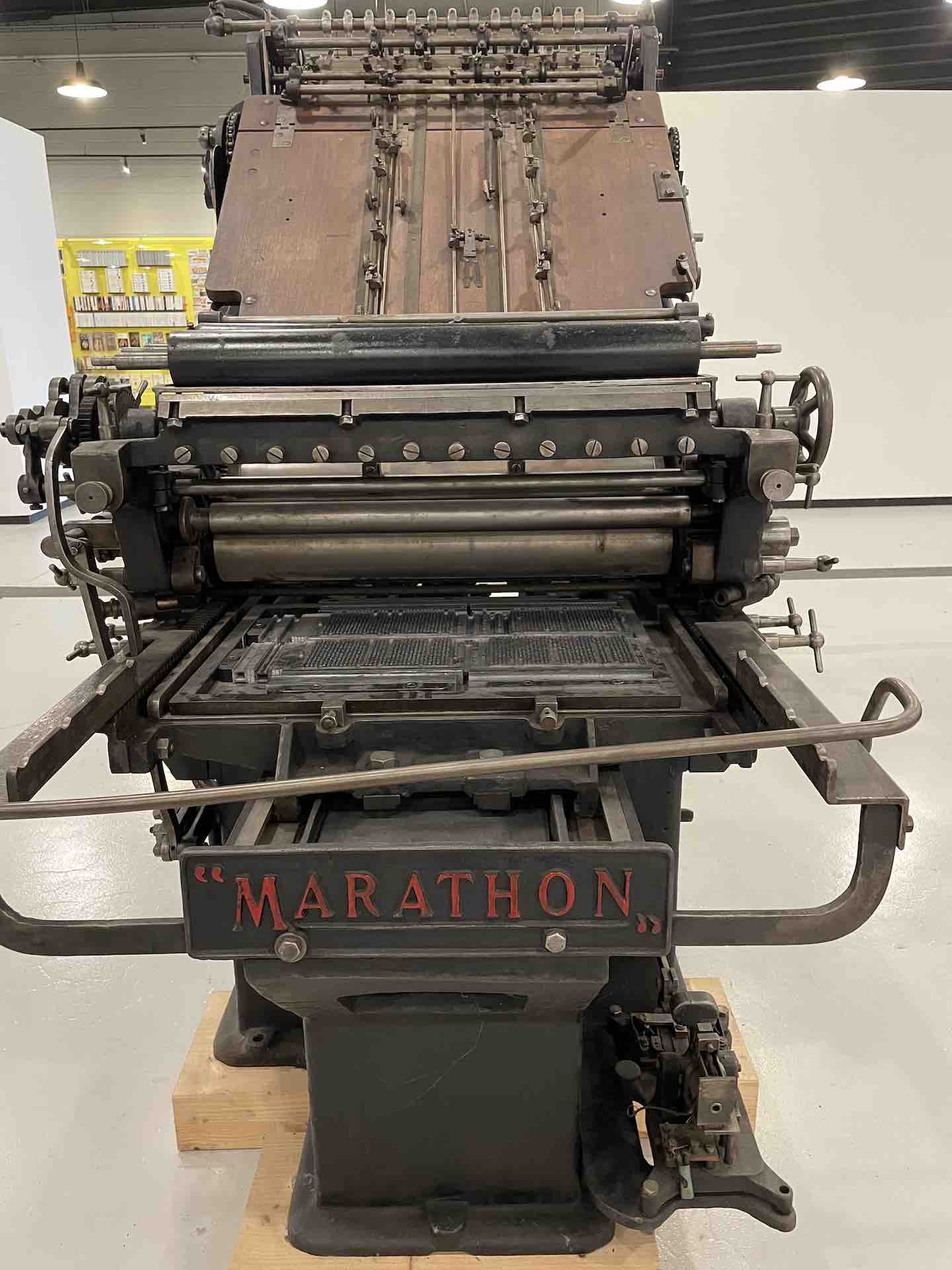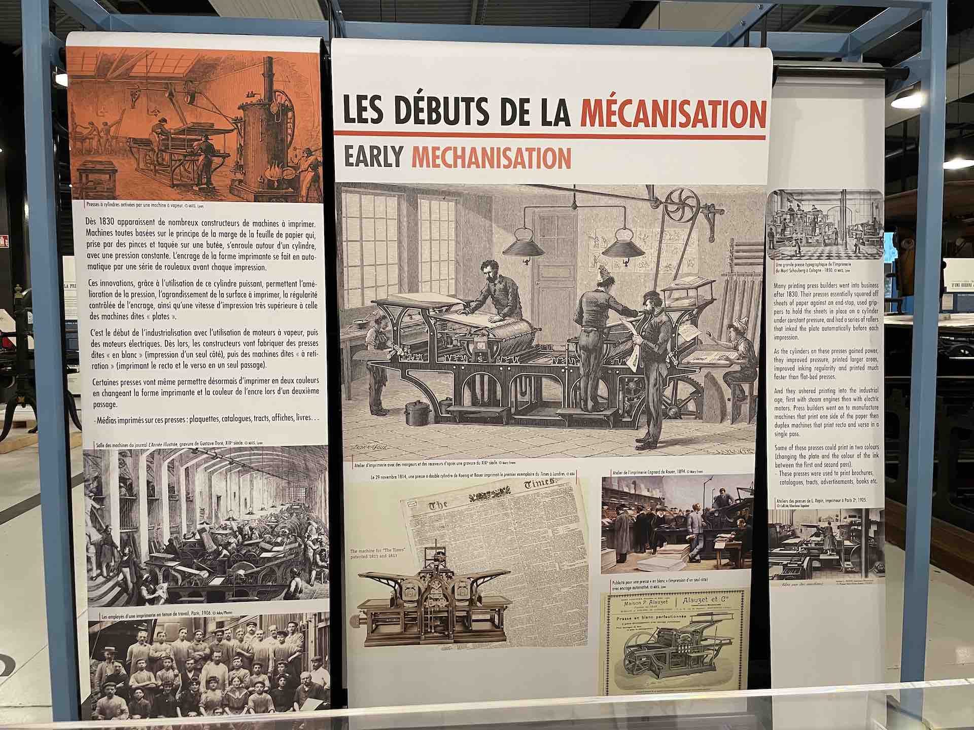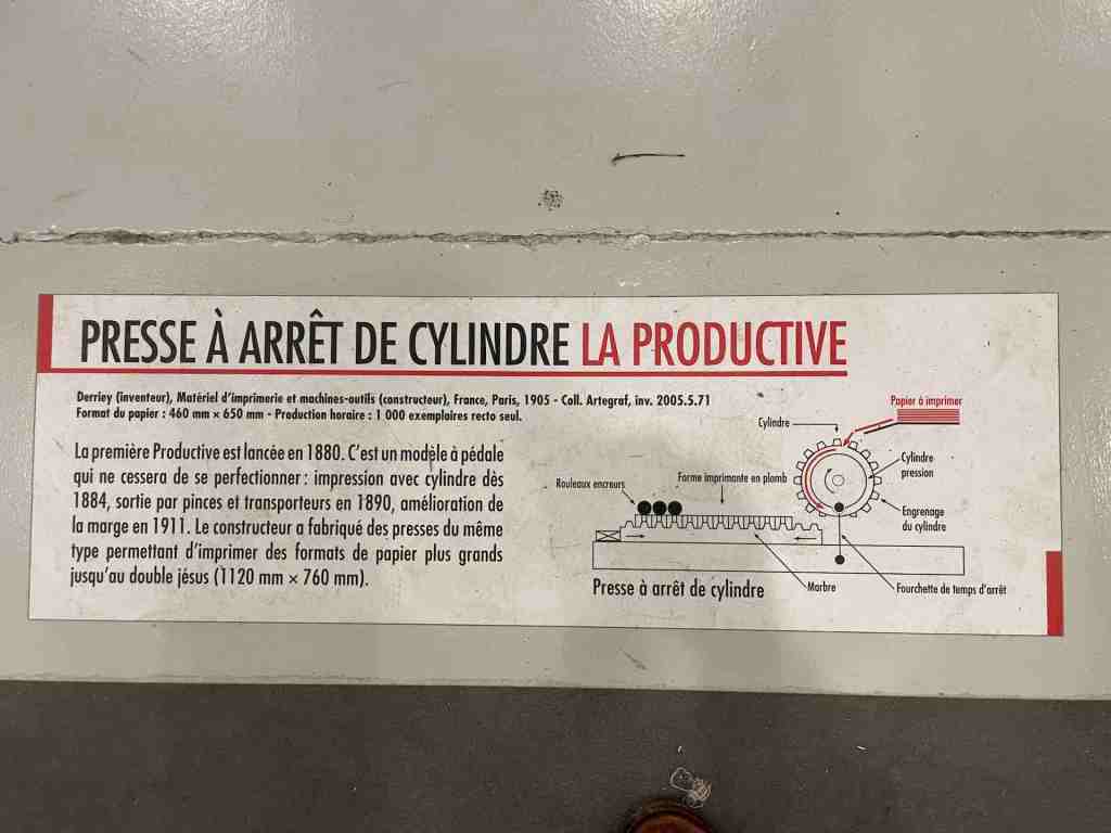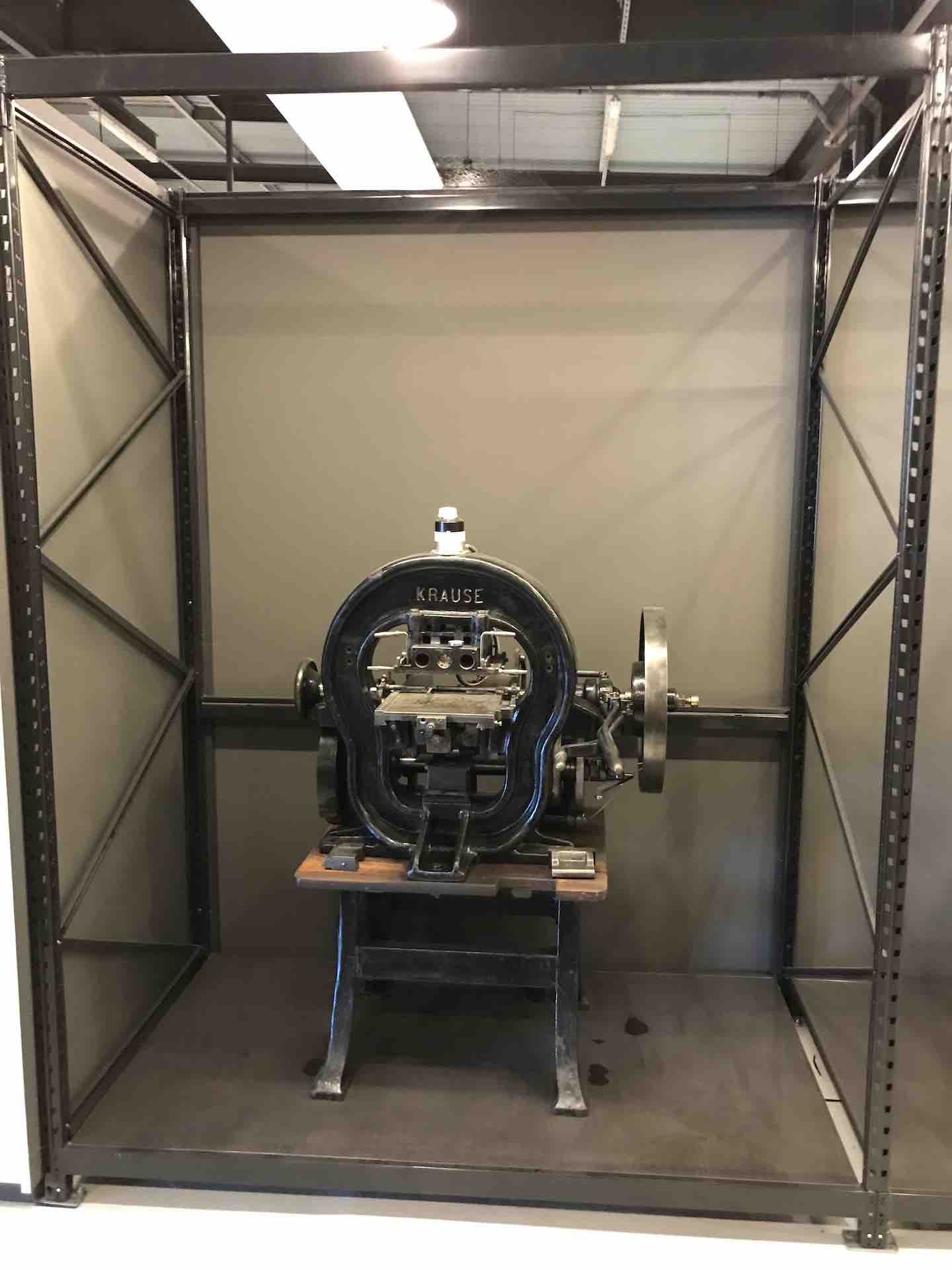 Les machines dont le Fonds Pozzoli est l’origine, un collectionneur passionné des mécaniques, sont mises en scène en majesté. On retrouve une rotative Goss, aux magnifiques rouages et rutilants rouleaux qui actionnées rappellent, par la rumeur continue de son fonctionnement, le niveau de nuisance sonore subie et supportée par les imprimeurs et le personnel travaillant dans les locaux professionnels, enchainant les embauches souvent en trois huit, les détails en sont protégés par une vitrine.